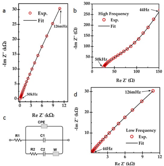 Electrochemical impedance spectroscopy (EIS) analysis results for LPEG in the BMP-FAP electrolyte. (a) Full-frequency fitted Nyquist data. (b) Prepared equivalent circuit. (c) High-frequency fitted Nyquist data. (d) Low-frequency fitted Nyquist data.