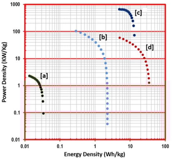 When comparing current supercapacitor technologies gravimetrically, it becomes apparent that there is certainly growth and parameterization to be had through variation of the structure and composition of the electrodes used; however, the electrolyte used has a demonstrative effect on the performance of the prepared devices that can be combined with these efforts to produce even further advances in the technology. More complex fabrication methods [,] have produced supercapacitors with good energy densities in aqueous solutions, 78.8 Wh/kg and 73 Wh/kg, respectively, that exhibited lower power densities when compared with other supercapacitor configurations. In the past, it was shown that innovative electrode materials [,,,] could be used to tailor balanced performance in terms of both energy and power. In these cases, as is often seen when attempting to optimize performance, a tradeoff exists between the two (Table 2). These results almost mirror one another, one with 27 Wh/kg and 17 kW/kg and another with 14 Wh/kg and 25 kW/kg. Thus, current technologies are seemingly held back by varying degrees of cost, feasibility, and scalability when limited to aqueous electrolytes.