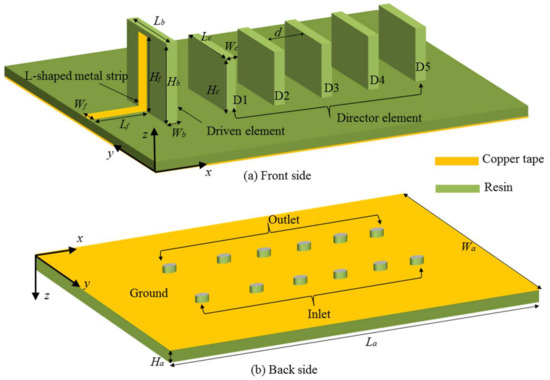 As can be seen from Figure 1, the antenna substrate is a solid rectangular plate with dimensions of La × Wa × Ha. The water dielectric resonator (driven element) is a larger rectangular hollow block with dimensions of Lb × Wb × Hb, while the director consists of five smaller rectangular hollow blocks and each element is with the identical dimensions of Lc × Wc × Hc. For the hollow driven element and five director elements, their wall-thickness is fixed to 0.5 mm, which is thin enough compared with a wavelength to eliminate its effects on the antenna’s radiation performance.