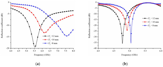 One should note that, for the hybrid DRA proposed in this work, the function of adopting L-shaped metallic strip is not only for antenna excitation, but also enhancing antenna radiation performance. To evaluate the effects of the L-shaped metallic strip, the simulated reflection coefficients with different values of Hf are analyzed. Two cases of the hybrid water DRA loaded with or without water are investigated. When the hybrid water DRA is unloaded with distilled water, namely Hw = 0 mm, it is defined as State 1. While the hybrid water DRA is loaded with a certain level of distilled water, i.e., Hw = 8 mm, the state is defined as State 2. Figure 3a shows the reflection coefficient of State 1, it can be observed that as the parameter Hf tuned from 8 mm to 12 mm with a step increment of 2 mm, the center resonant frequency varies from 7.6 GHz to 5.5 GHz. The phenomenon can be understood that the L-shaped metallic strip acts as a monopole antenna, and increasing the height of the vertical part (Hf) is equivalent to increase the electrical length of the monopole antenna. Therefore, the resonant frequency could be shifted downwards. Figure 3b shows the reflection coefficient of State 2. When the parameter Hf is varied from 8 mm to 12 mm, the center resonant frequency decreases from 5.1 GHz to 4.8 GHz. Compared to State 1, the center resonant frequency of State 2 has been shifted to lower frequency obviously because of adding the high permittivity materials of distilled water.