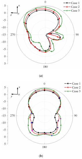 Measured radiation patterns for the proposed three cases. (a) xoz-plane; (b) xoy-plane.