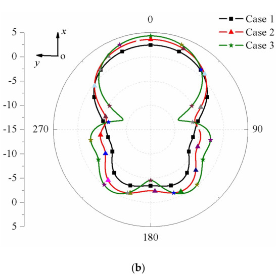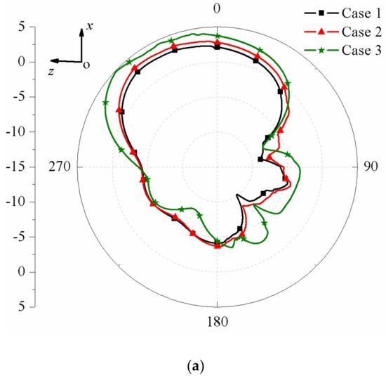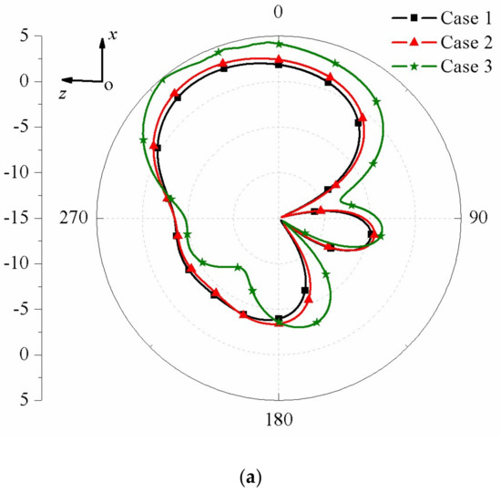 Simulated 2-D radiation patterns with d = 2 mm for the three cases. (a) xoz-plane; (b) xoy-plane.