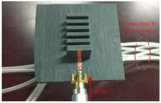 The measured reflection coefficients for the three cases mentioned in Section 3.2 are shown in Figure 12. It can be seen that the center resonant frequencies of Case 1, Case 2 and Case 3 are 4.48 GHz, 4.36 GHz and 4.27 GHz, respectively, which are very close to the simulated results as shown in Figure 5. Minor deviation may be traced to the manually operated syringe system and the tolerances caused by the manufacturing process.