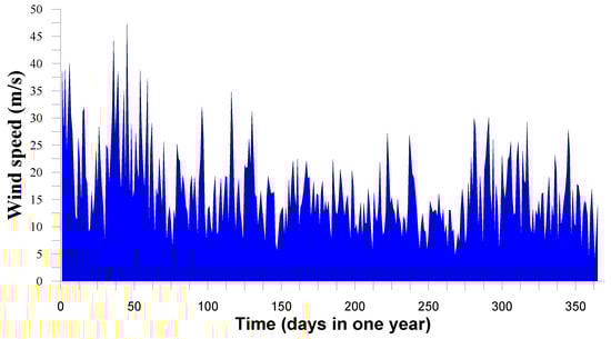 The hourly average power production of wind generators could be calculated using the wind movement speed at the peak of the standard hub; wind speed is obtained from the historical data, (Figure 2) the daily wind speed throughout one year in the area under study [,]. Selecting the practical model for wind turbine is very necessary. The generated power depending on the type and rated power of the wind turbine. Which can be expressed by: