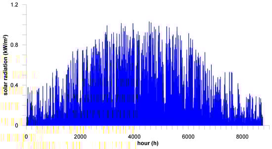 The optimization in designing a hybrid power generation systems in terms of solar cells is based upon reducing their numbers. The output of PV panels has to contain the impact of geographic location, for example, solar radiation, the season of the year, ambient temperature, the tiled surfaces, etc. The hourly solar radiation in the location under study shown in Figure 3. The output power of photovoltaic system is determined by Equation (3) [,,].