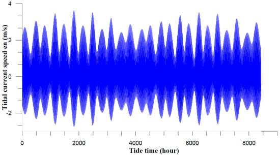 The advantages of tidal current energy are not impacted by much of climate condition such as rainfall, blowing wind, clouds, radiation, but is affected by tides, its location on the ground, water’s temperature and density. The strength of the tidal current changes, according to the distance of the moon about the sun and earth. The amplitude of the tide-generating pressure is about sun and moon caused by their corresponding distance and masses of the earth []. In this work, the hourly tidal current speed at the location under study is used for generating power is illustrated by Figure 4. The power generated by the tidal turbine can be estimated by the following Equation [,,]: