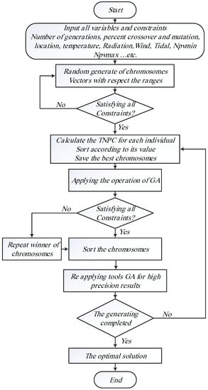 The Genetic algorithm (GA) is an heuristic search optimization strategy, built on the basis of the evolutionary ideas of natural picking and genetics such as the crossover and the mutation. The genetic algorithm is generally used to solve the nonlinear optimization problems by taking advantage of random searches with many possible solutions at the same time, not an individual point and uses the genetic algorithm operators instead of deterministic ones. It does not need other extra knowledge, but only the fitness functions or the objective function, the GA is able to solve the optimal global solution that is very complex to approach with other technical methods in multidimensional search areas []. In this paper, a GA was performed to search for the optimal configurations of PV modules, wind turbines, tidal turbines, battery bank, and converters that minimize the total cost represented by TNPC of the system, when taking in consideration all constraints. The flowchart of the applied GA algorithm optimization is shown in Figure 5. The first step in this approach, is to create a set of initial generations (chromosomes), which create randomly from the ranges of proposed solutions, each chromosome is controlled and configured in order to be as an ideal solution for the hybrid renewable power system. Selection of optimal chromosome in genetic algorithms based on variables of the optimization problem being solved. The chromosome is a collection of one vector of variables and each gene represent the parameters of one component of the hybrid system and must be best number depend on the fitness function that is evaluated for each chromosome. After that, all chromosomes fulfilling the limitation and constraints will be selected and arranged according to its fitness values from the best to the worst, while others chromosomes that are not meeting the limitations are ignored. Then, the three GA procedures; selection, crossover and mutation, are applied to all chromosomes. Generations are evaluated in each iteration and sorted according to their preferences, keeping the best chromosomes, and make sure they were investigating the restrictions.