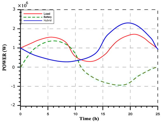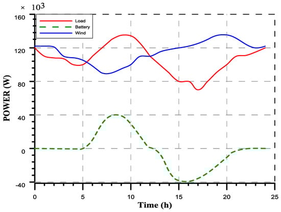 Variation in load, hybrid power and battery energy under the optimal hybrid system in a day Scenario 1.