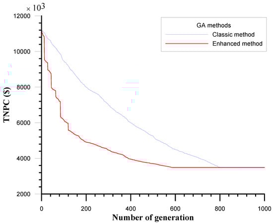 The proposed Genetic algorithm approach has been developed by adding new technology dealing with some of the genes within the winner chromosomes to get better and accurate results in a short time. The carried out strategy is able to continuously modulate the chromosomes, where, over next generations, the population develops towards the best solution. All the genetic algorithm advantages have been harnessed and developed to get the optimization of the solution and giving elasticity in the selection of system components. The economic problem was represented by minimizing the (TNPC) of a hybrid renewable energy system, considering many of conditions and constraint to ensure high reliability to satisfy the load demand.