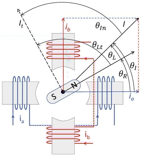 In a hybrid 2-phase stepper motor, the torque is generated by the interaction of the field produced by the rotor fixed magnet, and the field dynamically generated by the stator windings. The torque is composed by 3 components: the cogging, the reluctance, and the electrodynamic component [15,16]; however, in this work, the electrodynamic component, being predominant, is the only one considered. With reference to Figure 1, if and are the currents flowing in the 2 windings, the magnitude and angle of the resulting current is and . The motor torque is generated by combined to the load angle , i.e., the phase angle between the rotor position and the current position [15]: