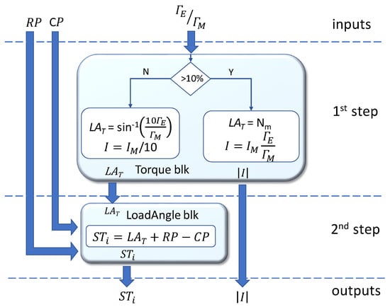 For a better understanding of the proposed method, Figure 2 summarizes the control procedure. The instantaneous desired torque, expressed as torque ratio , the present current position, , and rotor position, , are inputs to the procedure. The calculation is divided into 2 steps. In the first step (Figure 2, top), the torque ratio is compared to the 0.1 threshold. If higher (Y-branch of the graph in Figure 2), the load angle is fixed to the maximum, i.e., , corresponding to µ-steps, and the current magnitude is calculated according to (3a). On the other hand, if the torque ratio is lower than the threshold (N-branch of the graph in Figure 2), the current module is set to its minimum , and the torque is modulated through the load angle, as calculated by (3b).