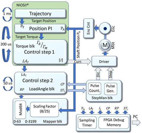 The proposed method is implemented in the FPGA of the DECA MAX10 board, and is sketched in Figure 4. This implementation refers to a stepper driver set for = 16 and a 10 k pulse-per-turn encoder; however, it can easily be adapted to different settings. The time-critical calculations, like the control loop (5), are implemented in the FPGA fabric and coded directly in VHDL, while parts of the remaining tasks are coded in the C language and run in a NiosII® soft processor included in the FPGA. This approach allowed low execution time for the control loop (5) and a faster and easier code development for the other tasks. The sections coded in the soft-processor include a conventional Proportional-Integral (PI) controller [10] and a simple trajectory generator, which are ancillary blocks that are necessary to allow the experimental test of the torque control method.