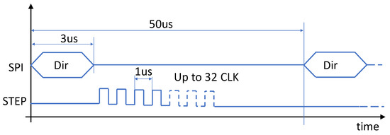 The trajectory controller updates the target position, PT, every 1 ms, and executes in 1.0 μs on a Nios processor clocked at 100 MHz. The PI controller and the torque control run every 200 μs, and execute the calculations in 1.5 μs only. This result is obtained using a look-up table for the sin inversion necessary in control step 1 (see Table 2, second row) for low torque condition. The remaining tasks, performed in FPGA fabric, are simple mathematical calculations or logic operations that take a few clock cycles at most to execute. The LoadAngle block (step 2 in Figure 2) is evaluated every 50 μs. In this period, the StepMan block issues a SPI command and a step-clock burst to the driver (see Figure 5). The SPI transmission, 1 byte at 4 MHz, takes about 3 μs. PowerSTEP01 driver requires a step-clock period of 1 μs, so the maximum length of the burst is of 32 μs (every position in a 64 μ-steps electrical circle can be reached by, at maximum, 32 μ-steps towards the shorter path). The minimum temporal length of a torque control loop is thus 3 + 32 = 35 μs, which fits well in the 50 μs period used here.