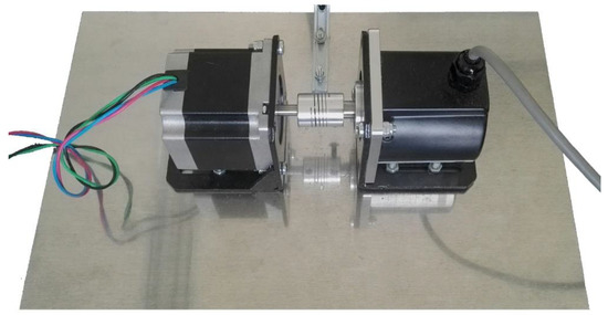 Experimental set-up with the stepper motor (left) connected to the encoder (right) through a flexible mechanical coupling (center).