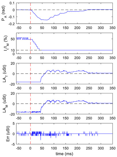 With the set-up used in previous experiment, the trajectory generator was disabled and the PI was enabled with its input fixed to PT = 0 (see Figure 4). The debug memory was programmed to save a parameter set every 200 μs. In this test, the motor shaft was loaded with an external positive torque, which was released at time t = 0. Figure 8 reports the shaft position measured by the encoder, PA, the current ratio, It/IM, the target angle, , calculated by the motor control, and the measured load angle, , together with its error with respect to the target angle.