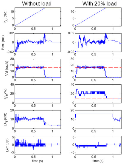 The measured position PA is reported on the 1st row of Figure 9. The movement lasted 0.83 s; it featured a typical “S” shape, which is barely visible because of the high acceleration used. The position error Perr is shown in the 2nd row. In the experiment with no load, the error peaks up to ±0.2 rad in the high acceleration/deceleration regions, but it is as low as 1 ± 2 mrad in the constant velocity region. The motor reacts to the acceleration in presence of load with an oscillation error of ±0.02 rad, which damps down in 200 ms. In the remaining part of the constant velocity region, the error is the same as in the no-load condition. With load, after the movement, the controller recovers the right steady position a bit more slowly with respect to no-load condition.