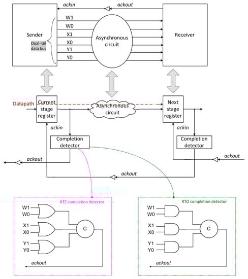 An asynchronous circuit stage present between two register stages (current and next) is correlated with the sender and receiver analogy. An example dual-rail data bus consisting of the encoded inputs (W1, W0), (X1, X0) and (Y1, Y0) is shown. The datapath is highlighted in brown dashed lines. The completion detectors, which would indicate i.e., acknowledge the receipt of the primary inputs, corresponding to the 4-phase return-to-zero (RTZ) and return-to-one (RTO) handshaking are also shown. The circle with the marking ‘C’ represents the (symmetric) Muller C-element.