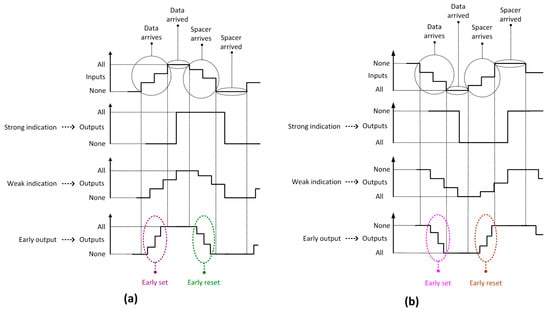 Early output circuits can produce all the primary outputs (data or spacer) after receiving just a subset of the primary inputs. If an early output circuit produces the data early, it is called early set type. On the contrary, if an early output circuit produces the spacer early, it is called early reset type. The early set and reset behaviors are captured within the violet and green ellipses in Figure 2a corresponding to the RTZ handshaking, and they are captured within the pink and brown dotted ellipses in Figure 2b corresponding to the RTO handshaking. A homogeneous composition of early output sub-circuits or a heterogeneous composition of strong indication and/or weak indication and early output sub-circuits would result in an early output circuit of the same kind as that of the early output sub-circuits comprising it.