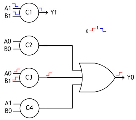 Asynchronous circuits featuring delay-insensitive data encoding and adhering to a 4-phase handshaking (RTZ or RTO) for data communication usually embed the monotonic cover constraint (MCC) [] in their underlying logic. To briefly explain what is the MCC, let us consider the dual-rail encoded realization of a 2-input AND function shown in Figure 3, corresponding to the 4-phase RTZ handshaking. (A1, A0) and (B1, B0) represent the dual-rail encoded primary inputs and (Y1, Y0) represents the dual-rail encoded primary output. The circles with the markings C1, C2, C3 and C4 in Figure 3 represent the 2-input Muller C-elements.