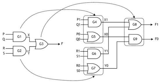 To shed the light on wire and gate orphans, we refer to Figure 4. Figure 4 shows a gate-level implementation of an example Boolean function F, expressed as F = PQ + RS, where P, Q, R and S are the primary inputs. A dual-rail logic equivalent that corresponds to the early output type is shown where F1 = P1Q1 + R1S1 and F0 = (P0 + Q0) (R0 + S0). The gate pairs (G4, G5), (G6, G7), and (G8, G9) form the respective early output logic equivalents of the gates G1, G2, and G3. X and Y are the intermediate single-rail outputs, and (X1, X0) and (Y1, Y0) are the intermediate dual-rail outputs.