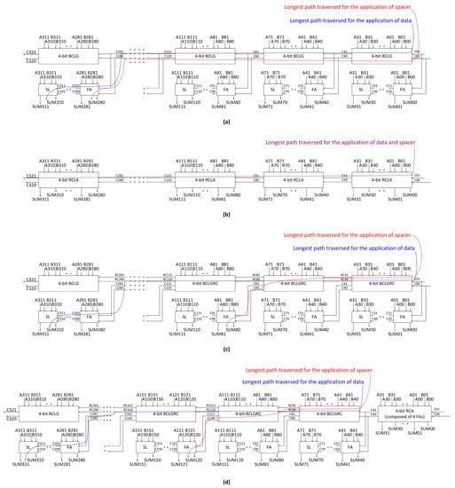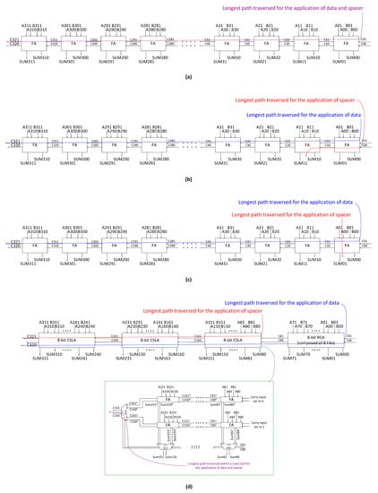 Longest datapaths traversed for the application of data and spacer in: (a) 32-bit ripple-carry adder (RCA) comprising strong indication full adders [,] or distributed weak indication full adders []; (b) 32-bit RCA comprising biased weak indication [,] or early output full adders []; (c) 32-bit relative timed RCA comprising early output full adders []; (d) an optimum 32-bit early output carry select adder (CSLA) []. FA refers to the full adder, and 2:1 MUX refers to the two-input multiplexer in the figures.