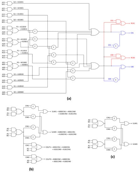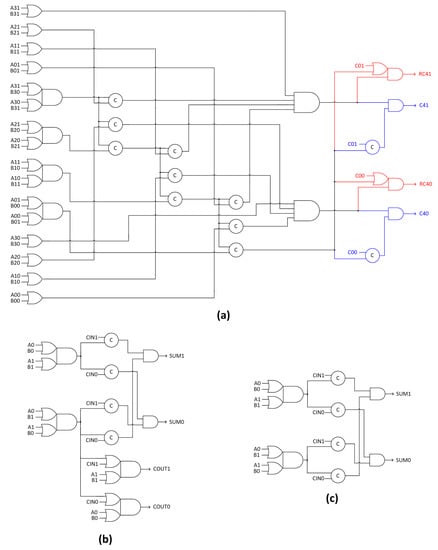 The logic rules for transforming an asynchronous design conforming to the RTZ handshaking into a design conforming to the RTO handshaking and vice-versa are given in [] along with the proofs, and an interested reader may refer to the same for details. The AND, OR, AO21 and AO22 gates in Figure 7 are replaced by their respective duals viz. OR, AND, OA21 and OA22 gates in Figure 8 to adhere to the RTO handshaking but their corresponding inputs are maintained the same. The C-elements in Figure 7 are retained in Figure 8 with the corresponding inputs. In Figure 8a, the logic highlighted in blue specifies the regular carry output (C41, C40), and the logic highlighted in red specifies the redundant carry output (RC41, RC40). In the absence of the logic highlighted in red, Figure 8a is interpreted as the 4-bit BCLG, used in Figure 6a,c,d, and in the presence of the logic highlighted in red, Figure 8a is interpreted as the 4-bit BCLGRC, used in Figure 6c,d.