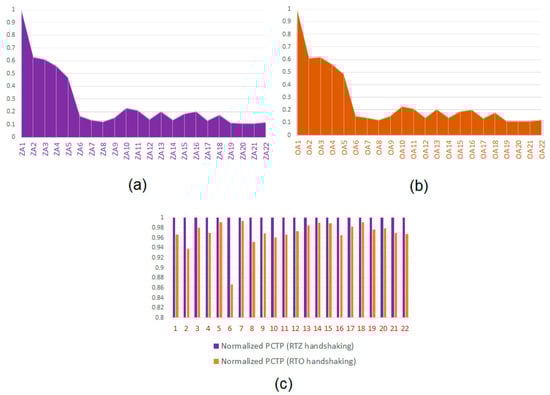 (a) Normalized power-cycle time products (PCTPs) of the asynchronous adders corresponding to RTZ handshaking; (b) normalized PCTPs of the asynchronous adders corresponding to RTO handshaking; (c) portraying a one-to-one mapping of normalized PCTPs of asynchronous adders (labelled as 1 to 22) with respect to RTZ and RTO handshaking.