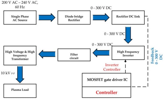 The block diagram of the HVHF plasma switching power supply is shown in Figure 2. A single phase AC source was applied as the input to the designed power supply. A diode full bridge rectifier circuit was designed as the initial stage of the plasma power supply. The circuit rectifies the 220 V AC voltage to DC output voltage [,,,,,,,,], which can be adjusted from 0 V to 300 V. A high frequency inverter circuit was designed and located, following by the rectifier DC link capacitor, which receives the DC voltage from the rectifier and converts it to a high frequency pulsating DC output voltage. The full-bridge PWM topology with high switching frequency was developed as an inverter circuit for the designed plasma power supply. A high voltage and high frequency transformer was designed and placed at the output of the inverter side. The high frequency pulsating DC output was connected to the primary side of the transformer. The transformer was designed with a ferrite PL-13 U core that could transform 290–300 V to 10 kV high voltage. The secondary side of the transformer that transformed the high voltage was connected to the plasma source, which was designed with titanium, quartz tube, and metal.