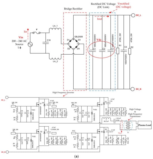 Figure 3 shows the schematic diagram of 4T analog MOS control plasma switching power supply. The single phase AC voltage was applied to the circuit. The GBJ2506 bridge rectifier was used along with the DC link capacitors. The designed rectifier full bridge consisted of four diodes that were arranged as shown in Figure 3.