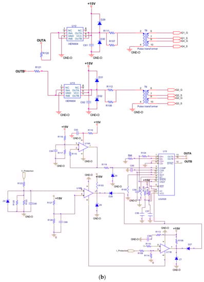 A high switching frequency high power PWM inverter circuit was designed and placed followed by the rectifier of the plasma power supply, as shown in Figure 3. The IXFK64N50P MOSFET was used as a switching device in the PWM full bridge inverter. The chosen MOSFET allowed a 500 V and 64 A maximum. This has a lower drain source resistance (85 m ohms) and fast intrinsic diode. An inverter driver circuit was designed along with a regulating pulse width modulator IC (UC2526) to operate the full bridge PWM inverter as shown in Figure 3b. The driver circuit generates two complementary PWM signals operating at 25 kHz with a 0.5 μs dead band. The MOSFET driver IXDN604SIA is dual high speed gate drivers are especially well suited for driving the MOSFETs and IGBTs. Each of the two outputs can source and sink 4 A of peak current while producing voltage rise and fall times of less than 10 ns. The input of each driver is virtually immune to latch up, and proprietary circuitry eliminates cross conduction and current shoot through. The pulse width modulator IC UC2526 is designed for fixed frequency. When the Q1, Q4 MOSFET switches ON and the Q2, Q3 MOSFET switches off, a positive DC voltage is obtained at the output. When the Q2, Q3 MOSFET switches ON and the Q1, Q4 MOSFET switches off, a negative DC voltage is obtained at the output. The MOSFET switches are switched alternately with a controlled duty ratio to convert input DC voltage into high frequency AC voltage suitable for exciting the plasma load. The PWM driver circuit was designed using 4 A dual low side ultrafast MOSFET drivers (IXDN604SIA). The 25 kHz inverter circuit can generate up to a 640 V peak to peak square wave voltage. The designed plasma power supply consisted of an over voltage, over current, and over temperature protection circuit. These protection circuits shut down both the phase controller and PWM controller in any unusual circumstances.