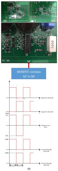 HVHF plasma power source driver and protection circuits. (a,b) Voltage and current protection circuit; (c) MOSFET driver circuit; (d) current and voltage waveforms of PWM inverter.