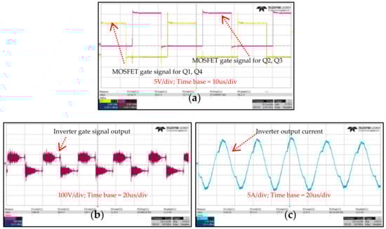High frequency PWM inverter control and output waveforms. (a) MOSFET gate signals; (b) inverter gate signal output; (c) inverter output current.