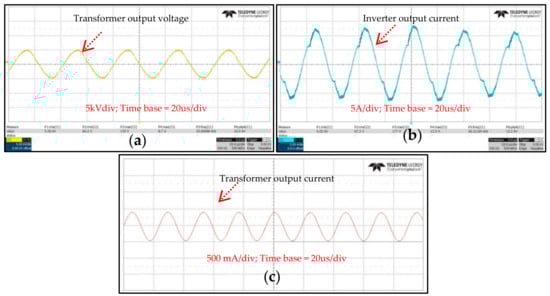 Figure 9 presents the HVHF plasma switching power supply output waveforms. Figure 9a shows the output voltage waveform of the transformer secondary side with the 10 kV. Figure 9b shows the output current waveform of inverter (5 A/div). The respective output current (500 mA/div) waveforms of the transformer secondary side that flow through the plasma source, as shown in Figure 9c. The output current of the inverter side was changed to a sinewave because of the series connected filter.