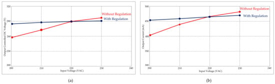 HVHF plasma switching power supply characteristic waveforms with and without regulation. (a) Input voltage vs. output DC controllable voltage; (b) input voltage vs. output current.