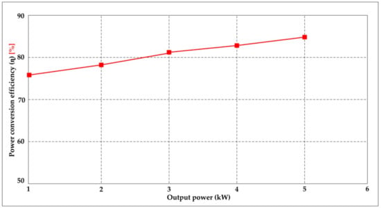 Figure 11 shows the power conversion efficiency. The MOSFET switches are used for high repetition rates (25 kHz), and excellent output power conversion efficiency is achieved from 75% to 85%, as shown in Figure 11. In order to examine the applied properties of the pulse generation arrangement, a set of prototypes was constructed. Basic experiments were plasma power supply design based on a topology depicted in Figure 3a (As in manuscript). The power supplied with an initial voltage is 200 VAC to 240 VAC and the DC initial voltage is 300 V DC. Capacitors were implemented using high voltage type with the value of C1 = C2 = C3 = 680 μF each. The overall the output voltage of system is 10 kVp-p. All the electrical waveforms were recorded using Teledyne Lecroy (350 MHz, 2 GS/s). Voltage pulse was measured by Teledyne Lecroy HighVoltage probe. Current was measured by a current monitor.