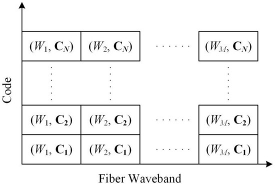 For simplicity, we assume that the PSD of the un-encoded light source is flat and un-polarized, and the central wavelength of the first WDM channel is shifted to λc = v/2M, where v is the width of the light spectrum. Assuming the jth label code vector Cj = [cj(1), cj(2)…cj(N)], where cj(h) is the hth chip of Cj and 1 ≤ h ≤ N, the PSD of a single SAC label (W1, C1) is obtained, as shown in Figure 5. In this figure, the optical spectrum with bandwidth v is occupied by M WDM channels, and each channel is sliced into N wavebands with a width of v/MN. The wavebands with a pulse correspond to the chip “1s” in Cj, whereas the chip “0s” corresponds to the bands with zero power.