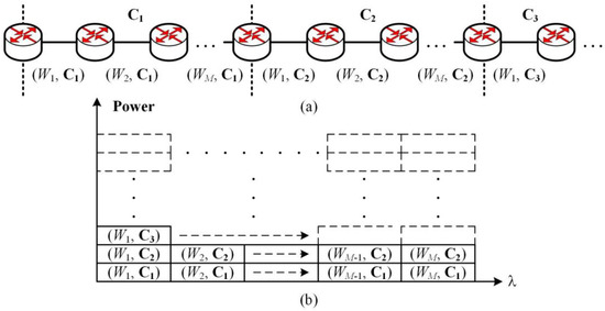 In this scenario, when (Wi, Cj) is occupied by a node, the label (Wi+1, Cj) is sequentially chosen for the next connection, where 1 ≤ i ≤ M − 1 and 1 ≤ j ≤ N. Figure 4a shows the mapping of the labels to the path connections. As for the structure of the label stack, for example, when (W1, C1) is chosen, (W2, C1) is assigned to the stack. Similarly, this procedure is repeated for (W3, C1), (W4, C1)…(WM, C1) until all the channels have exactly one label. Subsequently, (W1, C2), (W2, C2)…are assigned to the remaining nodes in a proper order. In this scenario, the channels have similar label numbers, as shown in Figure 4b. When a new label is stacked, the one with the same code index as the previous label is selected.