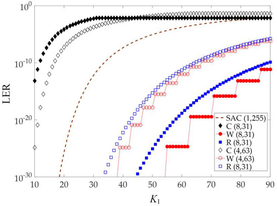 Figure 6 compares the LERs of the three label stacking scenarios in the GMPLS network for hybrid labels; here, (M, N) = (8, 31) and (M, N) = (4, 63). The parameters used for the simulations are the received power (P = −10 dbm), photo-diode responsivity (R = 0.81 A/W), and electrical bandwidth (B = 80 MHz). The LER of the sequential wavelength distribution is better than those of the sequential code distribution and random label distribution. This is because distributing all the labels among the wavelengths helps reduce the number of overlapping labels in the WDM channel, resulting in a lower noise variance. The system performance reduces when K1 is high, where PIIN variance is high. Given a fixed K, M = 4 is better than the case of M = 2, as the label number in channel W1 is lower. In addition, this figure shows the LER of the standard SAC labels, which can be expressed as the hybrid label in a single WDM channel (M = 1, N = 255). The SAC outperforms the sequential code distribution as the label stack is encoded in the entire bandwidth rather than the narrow WDM channels. However, its performance still cannot compete with the proposed scenario of sequential wavelength distribution.
