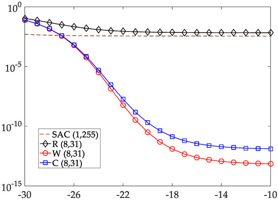 - Noshad, M.; Jamshidi, K. Bounds for the BER of codes with fixed cross correlation in SAC-OCDMA systems. J. Lightwave Technol. 2011, 30, 1944–1950. [Google Scholar] [CrossRef]