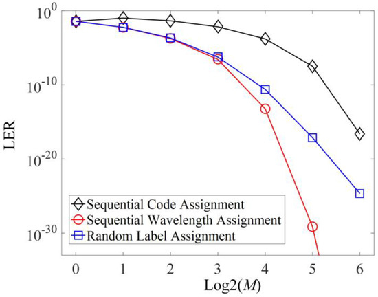 Figure 8 shows the LERs of the three stacking scenarios with respect to the number of WDM channels. The label number is 120. The stacking schemes with a higher M are found to exhibit better LERs. This is because of the fewer labels stacked in the WDM channels. Moreover, the sequential wavelength assignment once again outperforms the other two in terms of the LER, which is consistent with the results shown in Figure 6. The performance of the stacked SAC labels is not investigated in this figure, as the channel number M is always fixed to 1.