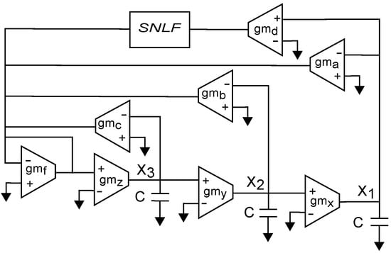 The goal of this article is the introduction of a current-mode PWL function to design the chaotic oscillator in Equation (3), using CMOS technology to program the generation of 2–7-scroll attractors. That way, Table 1 is the reference to design the CMOS OTAs to accomplish the values of the coefficients , and . According to Trejo-Guerra et al. [], there are very few integrated designs presented in the literature with this purpose, and they only generate up to five-scroll attractors. In this article, we highlight the design of a CMOS programmable current-mode PWL function to generate up to seven-scroll. The main idea is sketched in Figure 1, where the PWL function is generated from an input voltage () to provides an output current . This PWL function can be generated in either voltage-mode or current-mode . This article details the CMOS design of the current-mode PWL function labeled as saturated nonlinear function (SNLF) in Figure 2, which shows the OTA-capacitor () implementation of Equation (3), where the state variables are , and . By applying Kirchhoff’s current law to Figure 2, one gets Equation (4), where SNLF is described by , and the equations resemble the original ones defined by Equation (3). The operating frequency is evaluated by .