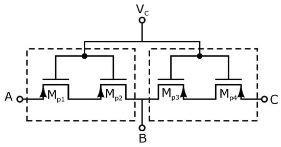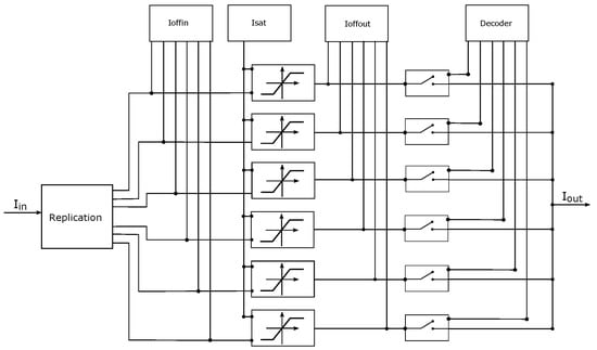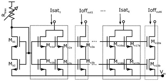 PWL techniques have been used extensively in circuits and systems theory to model nonlinear characteristics of electronic devices [,], and to study a large class of nonlinear resistive networks [,]. A SNLF series can be generated using the CMOS topology shown in Figure 5 to generate the PWL function that allows programmability of the break-points by tuning the currents Ioff, Ioff and I to implement the required plateaus and slopes. This approach has the following advantages: (1) the current mode circuits are in open loop configuration, being unconditionally stable; (2) the current mode blocks have high frequency performance; (3) the simplicity and modularity of the current-mode blocks make them very appropriate to approach a PWL function; (4) a small number of transistors is required for each block; and (5) the current mode blocks allow programmability of the breakpoints for each segment of the PWL function. It should be noted that, to generate a slope , it is necessary to inject an input signal . All transistors have sizes L = 0.7 m and W = 3.5 m, but the multiplicity is 4 for and 12 for .