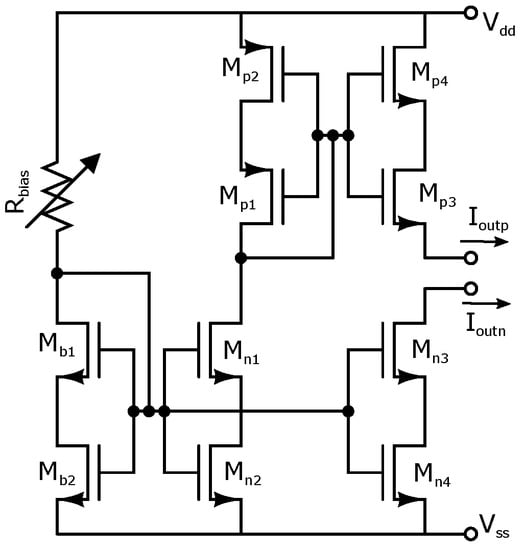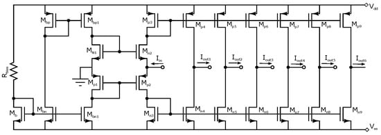 The majority of CMOS chaotic oscillators are based on OTAs. For example, the authors in [] highlighted the benefits of low-voltage implementation, integrability and electronic tunability. Following this direction, in this work, we highlight the programmability of the PWL function enabled through current mode cells and the transconductances of the OTAs to tune the fractional values of the coefficients and listed in Table 1. By using the current mode cell shown in Figure 5, we propose the CMOS design sketched in Figure 6 to generate 2–7 scrolls by programming the parallel connection of all the saturated blocks. The current mode blocks are modified by the shift currents Ioff and Ioff. The saturated regions are limited by the bias current . That way, to connect current mode blocks to generate n-scroll, a 3–8-bit decoder is designed. As one sees, the input currents to each current mode block are copies of the input current , generated from the class AB current mirror shown in Figure 7. To generate seven scrolls, six copies of the input current are required. The transistor sizes of the multi-output current mirror using 0.35 m CMOS process from AMS are listed in Table 4. The electrical characteristics are: current gain of 1.005, dynamic range of mA, = 1.168 K, = 748.4 K, and A.