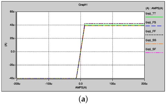 PVT variation simulations are performed to verify the robustness of our proposed current mode block using the BSIM3v3 model. The tested corners are: (NMOS–PMOS) typical–typical, fast–fast, fast–slow, slow–fast, and slow–slow (TT, FF, FS, SF, and SS, respectively) of the 0.35m CMOS technology. The temperature is swept from C to C in steps of C. Figure 8 and Figure 9 show the PVT simulation results.