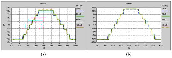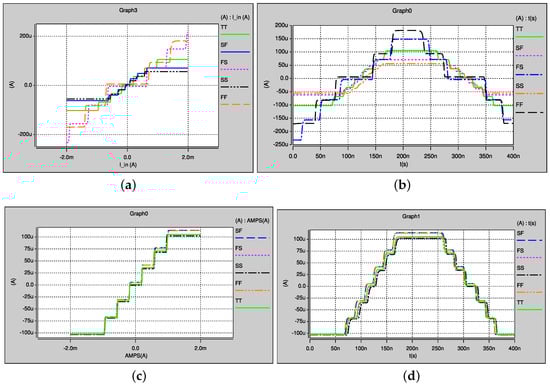 PVT simulation of the proposed PWL function to generate seven-scroll: (a,b) without adjustment of the current offsets; and (c,d) with adjustment of the current offsets.