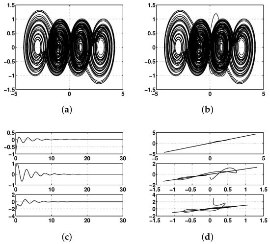 Master–slave synchronization of two four-scroll chaotic attractors with : (a) master oscillator; (b) slave oscillator; (c) error synchronization; and (d) error phase diagram for the states of the master x and the slave .