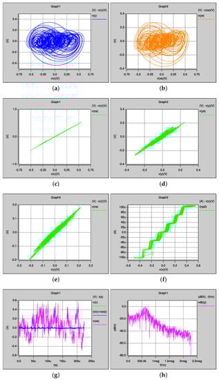 Post-layout simulation for the synchronization of two seven-scroll chaotic oscillators with optimized MLE: (a) master oscillator showing vs. ; (b) slave oscillator showing vs. ; (c) synchronization of vs. ; (d) synchronization of vs. ; (e) synchronization of vs. ; (f) SNLF to generate seven-scroll; (g) synchronization error ; and (h) FFT analysis of showing Khz.