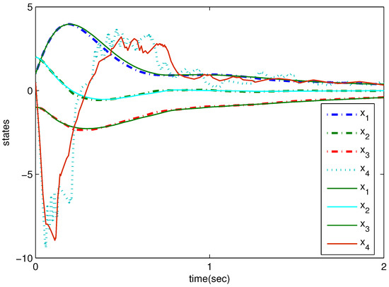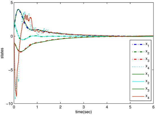 The system states’ evolution curves (the proposed method with solid lines, the memoryless design method with dashed lines).