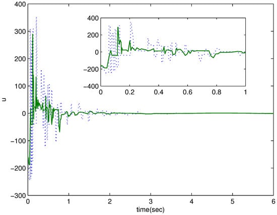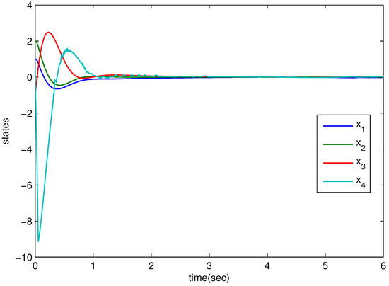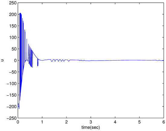 For the proposed ESMC design methodology of the linear uncertain MS, we show an example in this section to validate its effectiveness. During the MATLAB simulation, the following data are chosen: , , , , , , , . Now, suppose that the control input is added to the memristive system as done in [24,42]; thus, we have: