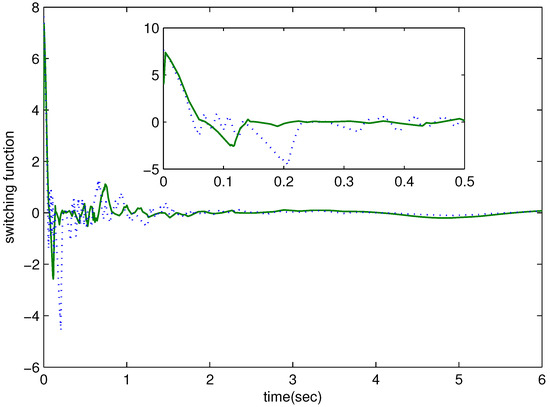 In order to show the advantage of the proposed design method in this paper, we provide some comparison results with the ESMC with traditional memoryless switching hyperplane design approach. By solving LMIs with , one can get . At the same time, the performance index , which is bigger than the obtained by the proposed design method in this paper. The responding simulation results are shown in Figure 2, Figure 3, Figure 4 and Figure 5 and Figure 7. It can be observed from the state response curves that the control input response curve and the switching function response curve that better control the performance are achieved by the proposed method in this paper.